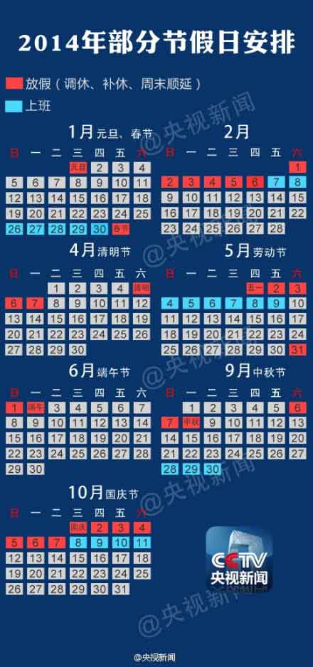 各省、自治區(qū)、直轄市人民政府,國(guó)務(wù)院各部委、各直屬機(jī)構(gòu): 經(jīng)國(guó)務(wù)院批準(zhǔn),現(xiàn)將2014年元旦、春節(jié)、清明節(jié)、勞動(dòng)節(jié)、端午節(jié)、中秋節(jié)和國(guó)慶節(jié)放假調(diào)休日期的具體安排通知如下。 一、元旦:1月1日放假1天。 二、春節(jié):1月31日至2月6日放假調(diào)休,共7天。1月26日(星期日)、2月8日(星期六)上班。 三、清明節(jié):4月5日放假,4月7日(星期一)補(bǔ)休。 四、勞動(dòng)節(jié):5月1日至3日放假調(diào)休,共3天。5月4日(星期日)上班。 五、端午節(jié):6月2日放假,與周末連休。 六、中秋節(jié):9月8日放假,與周末連休。 七、國(guó)慶節(jié):10月1日至7日放假調(diào)休,共7天。9月28日(星期日)、10月11日(星期六)上班。 節(jié)假日期間,各地區(qū)、各部門(mén)要妥善安排好值班和安全、保衛(wèi)等工作,遇有重大突發(fā)事件,要按規(guī)定及時(shí)報(bào)告并妥善處置,確保人民群眾祥和平安度過(guò)節(jié)日假期。 國(guó)務(wù)院辦公廳 2013年12月11日 |